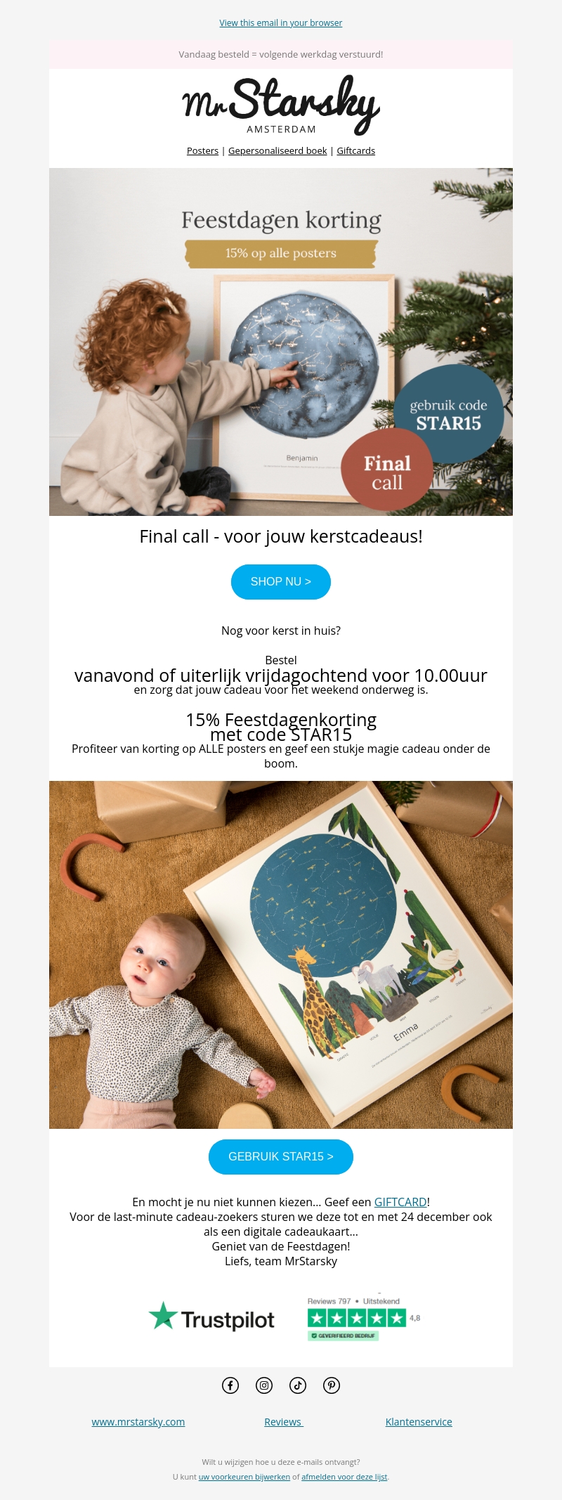 Mis deze laatste kans niet om een prachtig cadeau op tijd in huis te hebben voor Kerst. Ontvang 15% korting op alle posters bij MrStarsky met de code STAR15. Bestel nu om te profiteren van de feestelijke aanbiedingen en maak van je kerst iets speciaals. Ook beschikbaar als digitale cadeaubon voor de ultieme last-minute shoppers. Geniet van de feestdagen en geef een uniek geschenk.