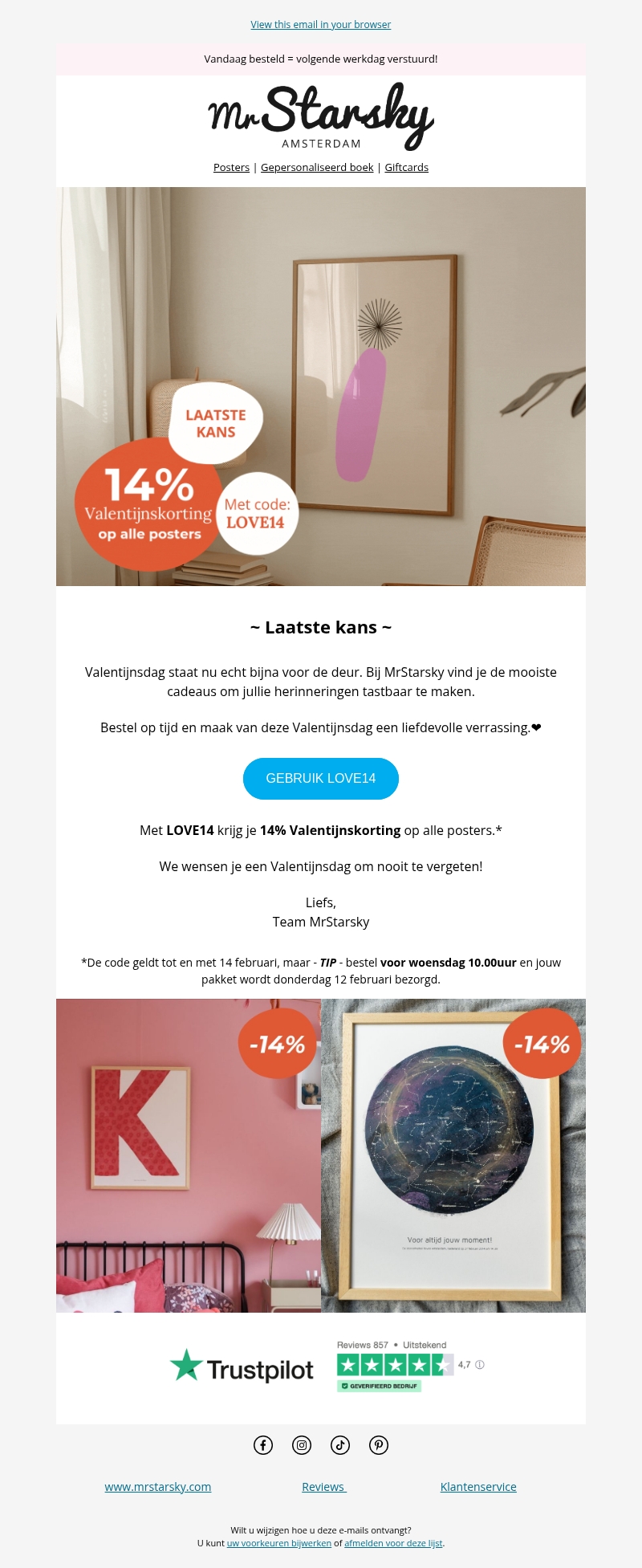 Valentijnsdag is nabij en MrStarsky biedt geweldige deals. Ontvang 14% korting op alle posters met de code LOVE14. Vind de perfecte cadeaus om je geliefde te verrassen. Bestel voor 14 februari en maak herinneringen tastbaar. Geniet van een onvergetelijke Valentijnsdag.