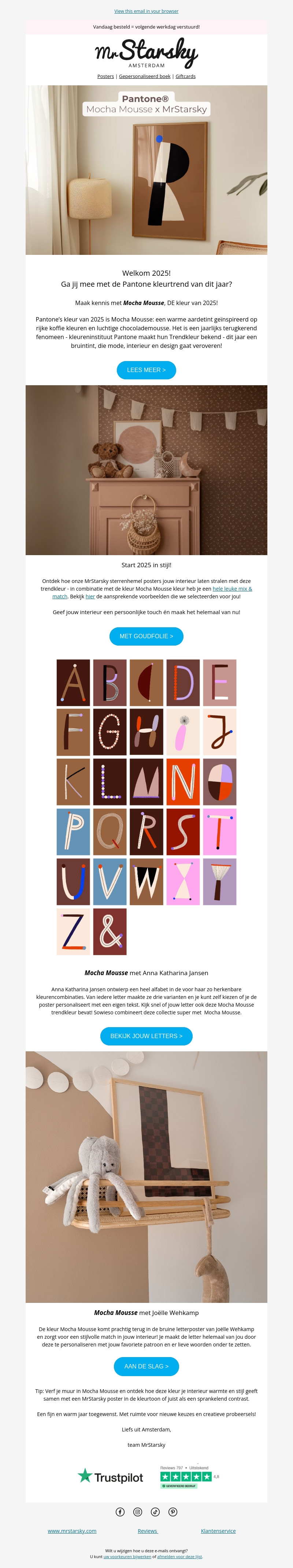 De trendkleur van 2025, Mocha Mousse, biedt een chique en warme uitstraling voor elke ruimte. MrStarsky Amsterdam presenteert unieke posters die perfect passen bij deze rijke kleur. Combineer stijl en persoonlijke touch met handgemaakte ontwerpen. Ontvang inspiratie voor een verfrissend interieur in het nieuwe jaar. Stel je eigen unieke poster samen met Mocha Mousse als hoofdkleur.