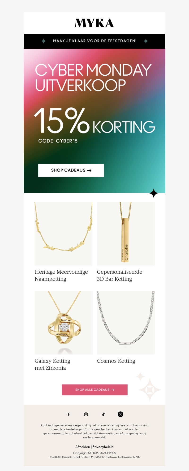 Klaar voor de feestdagen met speciale kortingen in onze Cyber Monday uitverkoop. Ontvang 15% korting op prachtige sieraden, waaronder naamkettingen, 3D bar kettingen en veel meer. Gebruik de code CYBER15 bij het afrekenen. Mis deze kans niet om de perfecte cadeau te vinden voor jezelf of je geliefden.