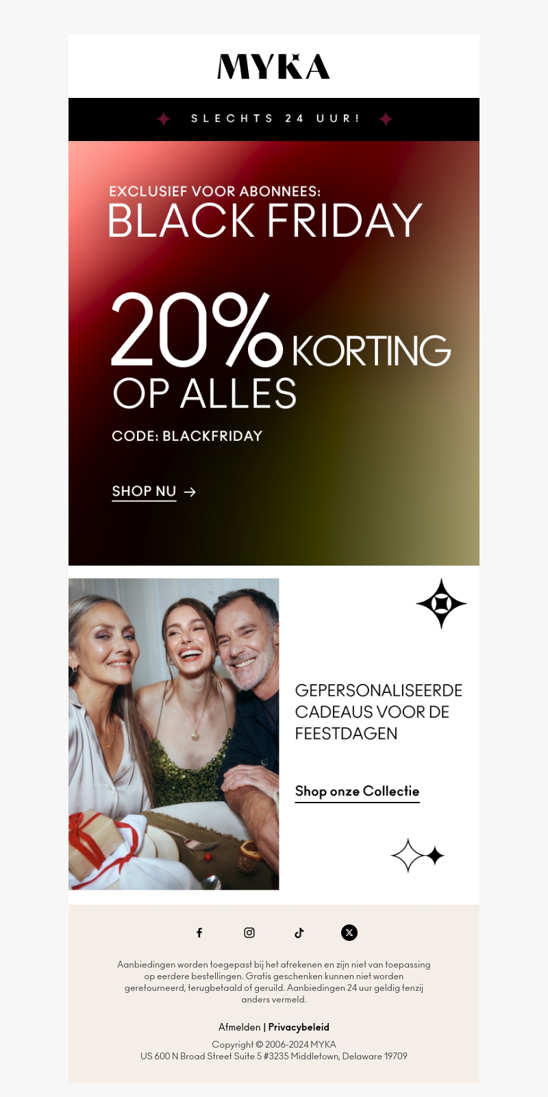 Ontdek de exclusieve Black Friday aanbieding van MYKA! Voor slechts 24 uur krijg je 20% korting op alles in de winkel. Dit is het moment om gepersonaliseerde cadeaus te halen voor de feestdagen. Mis deze unieke kans niet en gebruik de code BLACKFRIDAY bij aankoop.