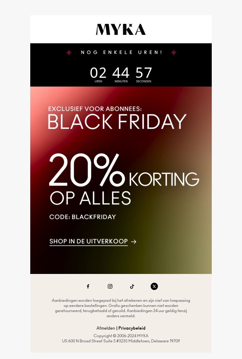 De tijd dringt met nog maar enkele uren tot Black Friday! Profiteer nu van 20% korting op alles, exclusief voor onze abonnees. Gebruik de code BLACKFRIDAY bij het afrekenen. Bezoek onze uitverkoop en ontdek geweldige deals die je niet wilt missen. Deze aanbieding is slechts 24 uur geldig.