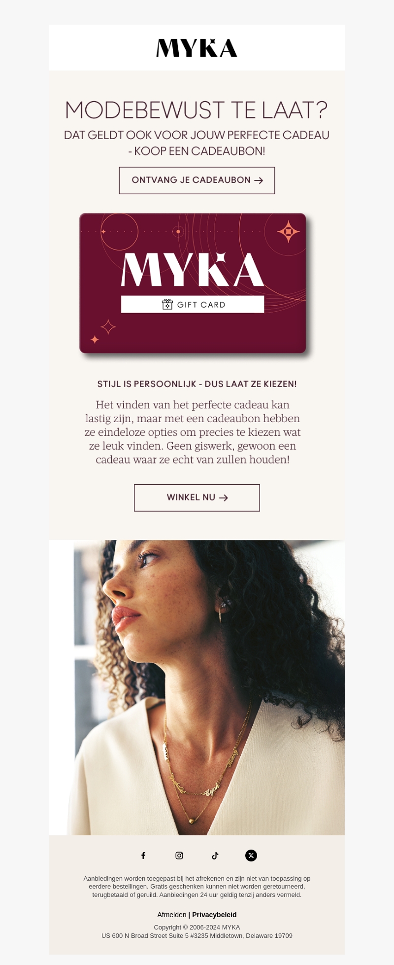 Vind je het moeilijk het perfecte cadeau te kiezen? Geef een Myka cadeaubon! Laat de ontvanger zijn favoriete stijl kiezen zonder stress. Het perfecte cadeau voor elke gelegenheid. Winkel nu en maak iemand blij!