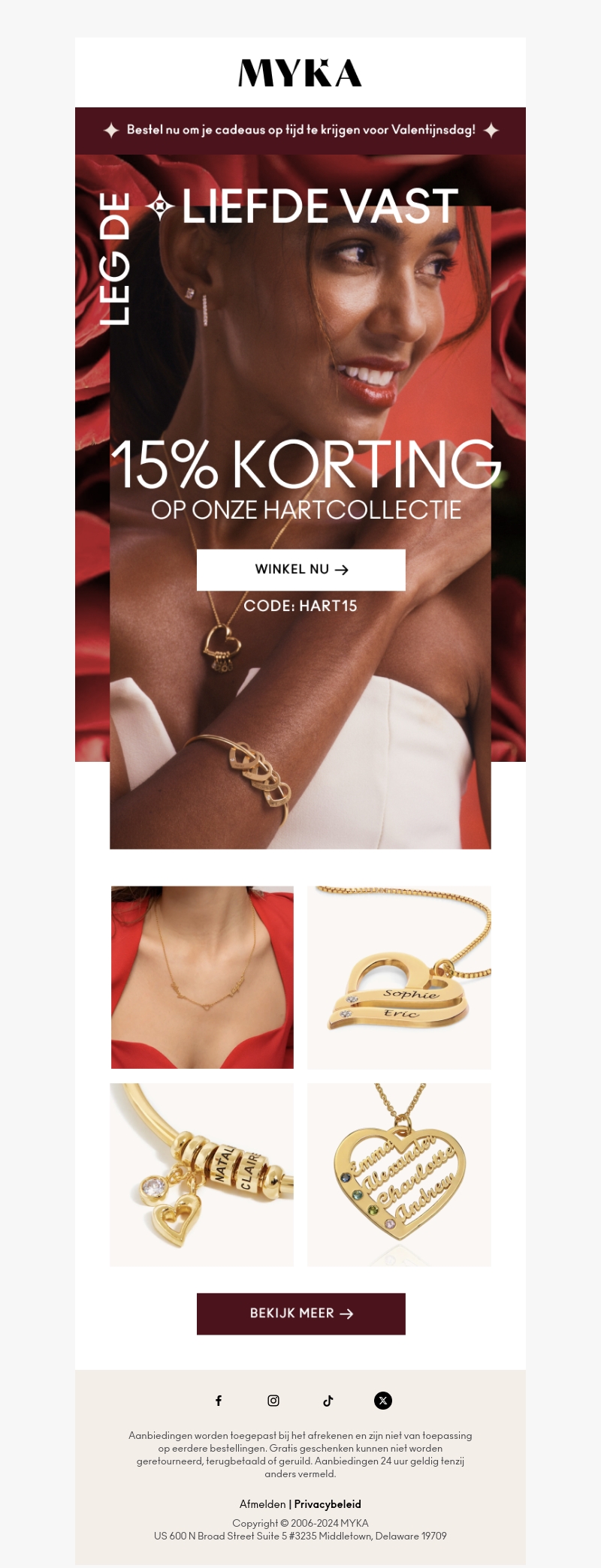 Verwen je geliefde met een speciaal cadeau uit de Hartcollectie en geniet van 15% korting. Onze unieke sieraden zijn perfect voor Valentijnsdag. Gebruik de code HART15 bij het afrekenen. Bestel nu en zorg dat je cadeau op tijd is! Deze aanbieding is een perfecte manier om je liefde te tonen.