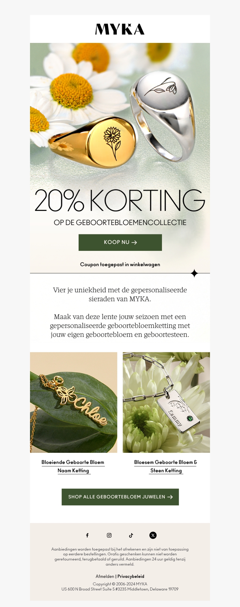 Ontdek de schoonheid van gepersonaliseerde sieraden met een unieke geboortebloem. MYKA biedt nu 20% korting op hun geboorte bloemencollectie. Perfect voor jezelf of als cadeau, deze sieraden combineren elegantie met persoonlijke betekenis. Verken de chique collectie en vind het sieraad dat bij je unieke persoonlijkheid past. Profiteer vandaag nog van deze speciale aanbieding. Shop nu en maak het seizoen nog specialer!