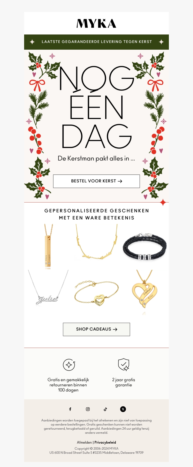 De laatste dagen om je kerstcadeaus op tijd te bestellen zijn aangebroken. Ontdek de prachtige gepersonaliseerde sieraden van Myka en maak deze kerst onvergetelijk. Kies uit een breed assortiment van unieke stukken, ideaal voor je geliefden. Gratis retour binnen 100 dagen en een garantie van 2 jaar. Mis deze kans niet om iemand speciaal te verrassen!