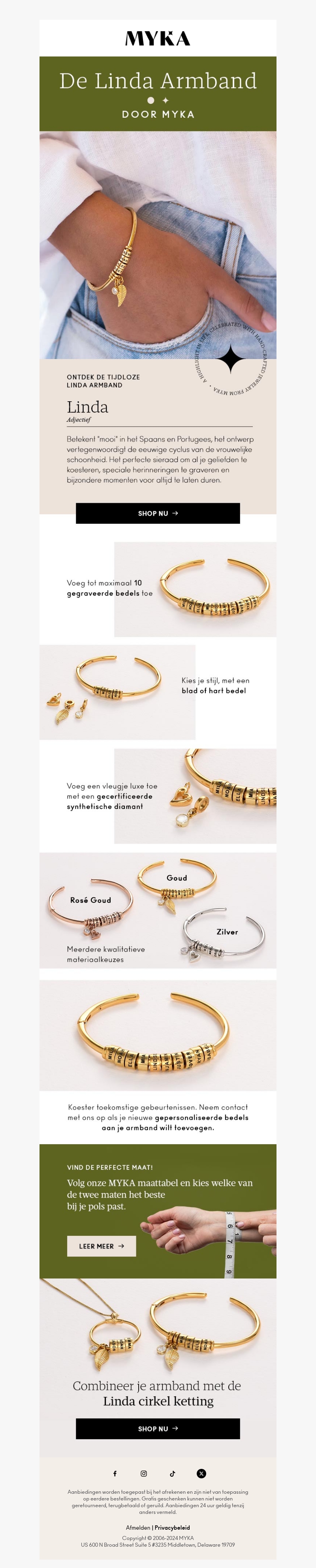 De Linda Armband van MYKA combineert verfijning en persoonlijke betekenis. Met opties voor personalisatie en gravures, creëer je een uniek sieraad dat bij jouw stijl past. Kies uit materialen zoals goud, zilver en rosé goud. Maak jouw armband extra bijzonder met gegraveerde bedels en synthetische diamanten.