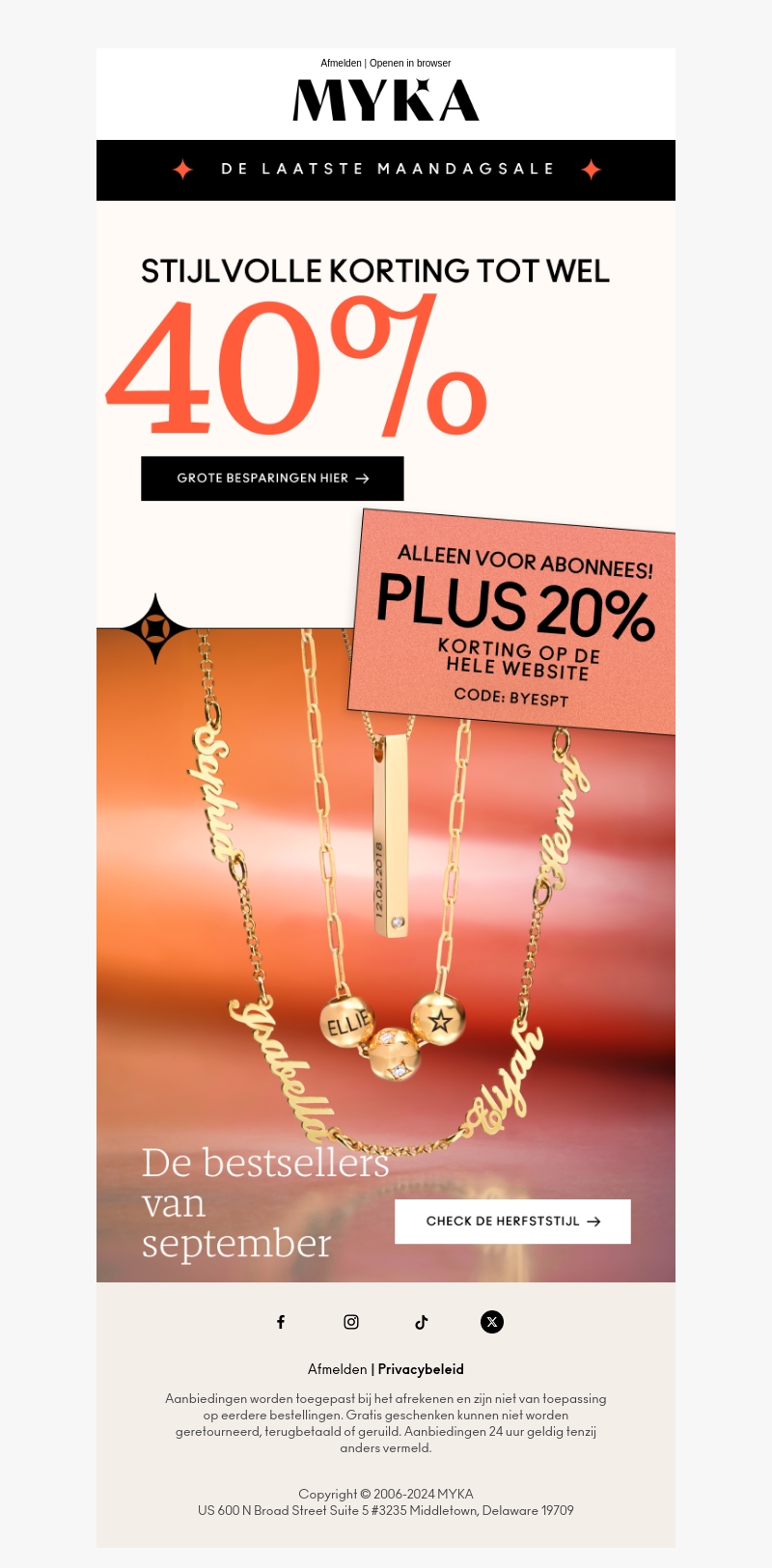 Geniet van de stijlvolle kortingen tijdens onze Maandagsale bij MYKA. Profiteer van kortingen tot wel 40% op een breed scala aan producten. Alleen voor abonnees bieden we bovendien een extra 20% korting aan met de code BYESPT. Bekijk de bestsellers van september en ontdek de nieuwste herfststijl!