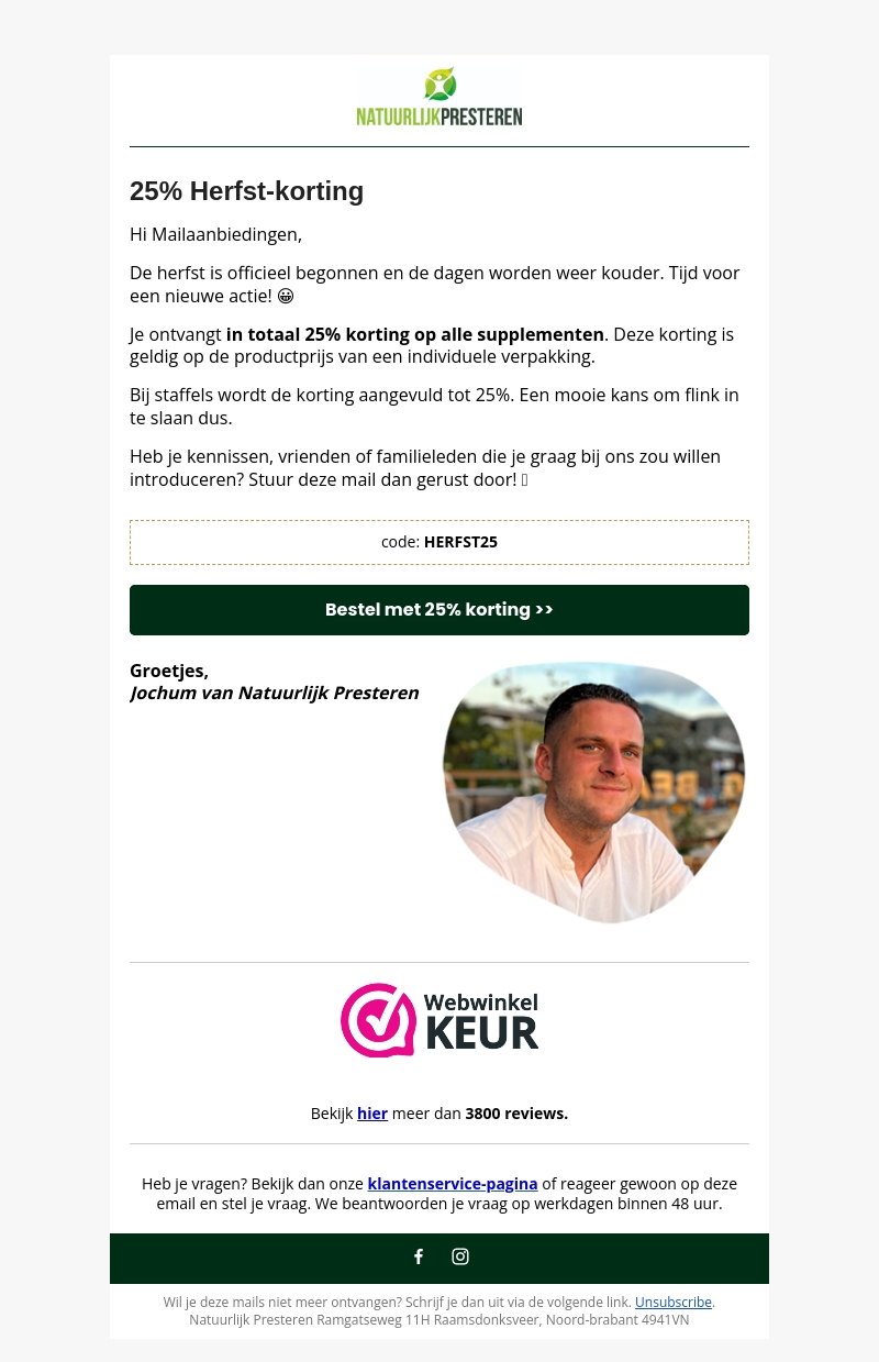 De herfst is begonnen en dat betekent nieuwe aanbiedingen! Krijg nu tot 25% korting op alle supplementen. De korting wordt bij staffels uitgebreid tot 25%. Gebruik de code HERFST25 voor extra korting. Stuur deze mail door naar vrienden of familieleden!