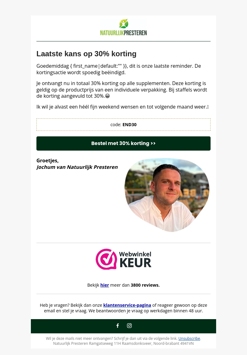 Goedemiddag, dit is je laatste kans om 30% korting te ontvangen op alle supplementen. De actie eindigt binnenkort. Gebruik de code END30 en bestel nu met 30% korting.