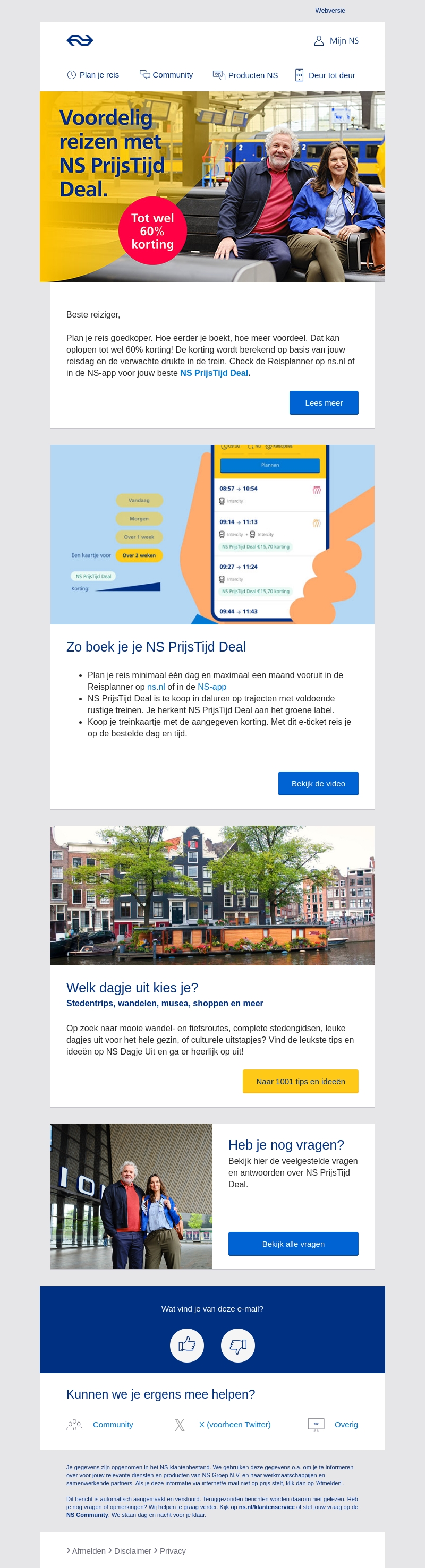 Ontdek hoe je goedkoper kunt reizen met de NS PrijsTijd Deal. Boek je reis vooraf en profiteer van kortingen tot wel 60%. Deze aanbieding geldt voor rustige treinen en wordt berekend op basis van jouw reisdag en de verwachte drukte. Plan je trip via de NS-app en geniet van voordelig reizen door heel Nederland.