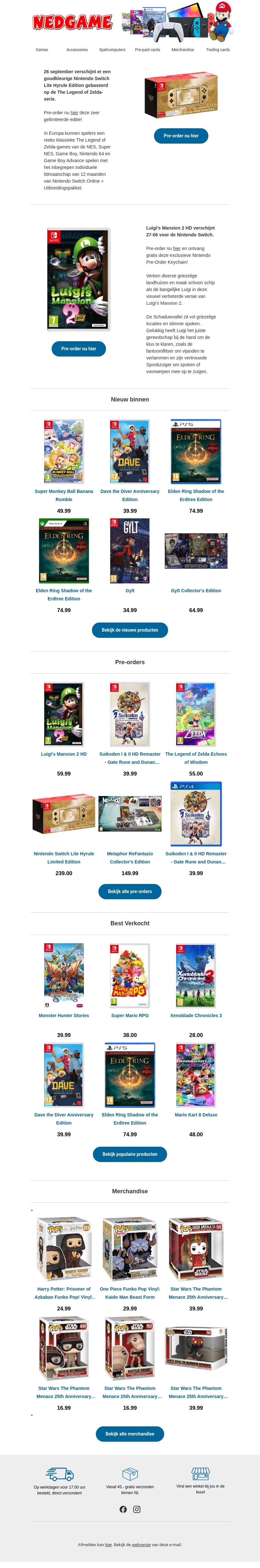 Op 26 september kun je de gouden Nintendo Switch Lite Hyrule Limited Edition bemachtigen, geïnspireerd door The Legend of Zelda-serie. Bovendien verschijnt op 27 oktober de Luigi's Mansion 2 HD met een exclusieve Nintendo Pre-Order sleutelhanger. Pre-order nu en mis deze geweldige kans niet!