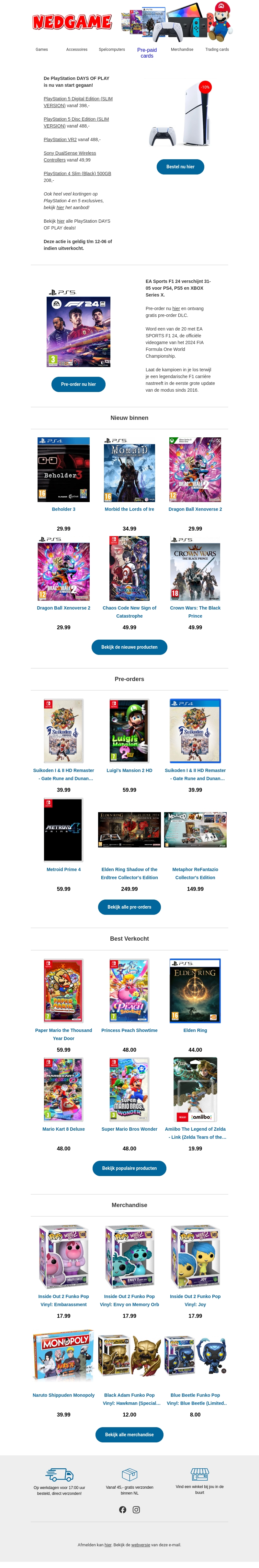 De PlayStation DAYS OF PLAY is nu begonnen met fantastische aanbiedingen op diverse games en consoles. Deze week: EA Sports F1 24 voor PS4, PS5 en Xbox. Profiteer ook van kortingen op PlayStation 5 Digital Edition, Sony DualSense Wireless Controllers, en meer. Mis deze unieke deals niet!