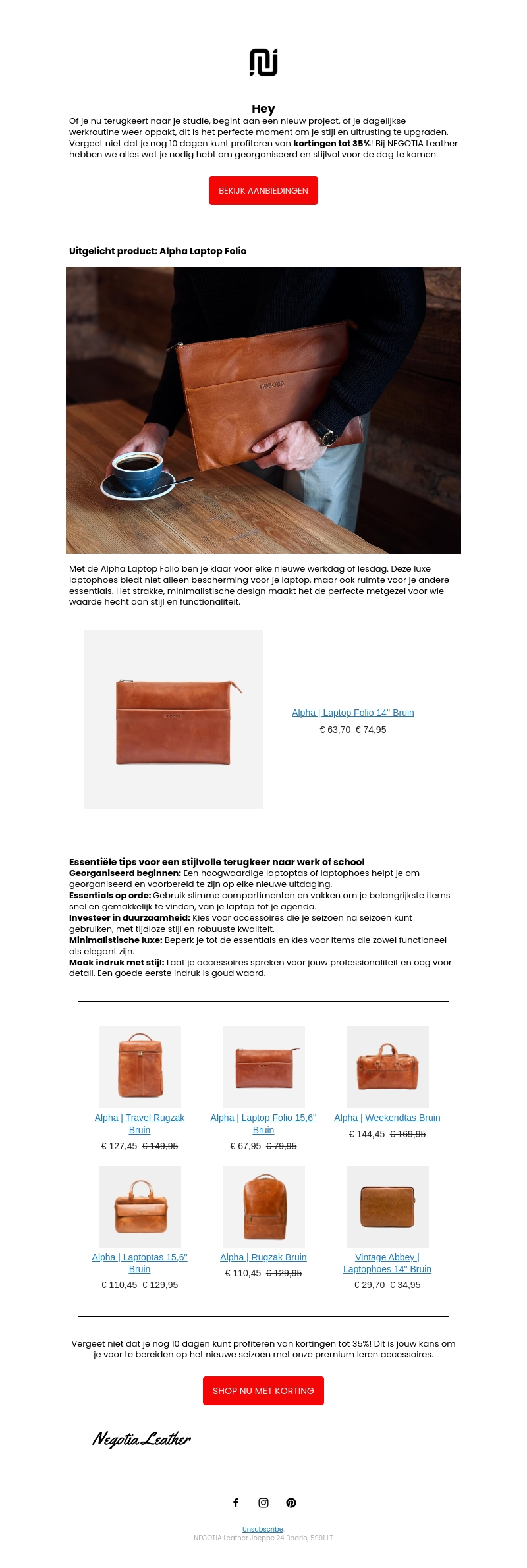 Of je nu terugkeert naar je studie of een nieuwe uitdaging start, het is tijd voor een upgrade! Geniet van exclusieve kortingen tot 35% op onze premium leren accessoires. Bekijk ons aanbod van laptop folio's, reistassen en meer.