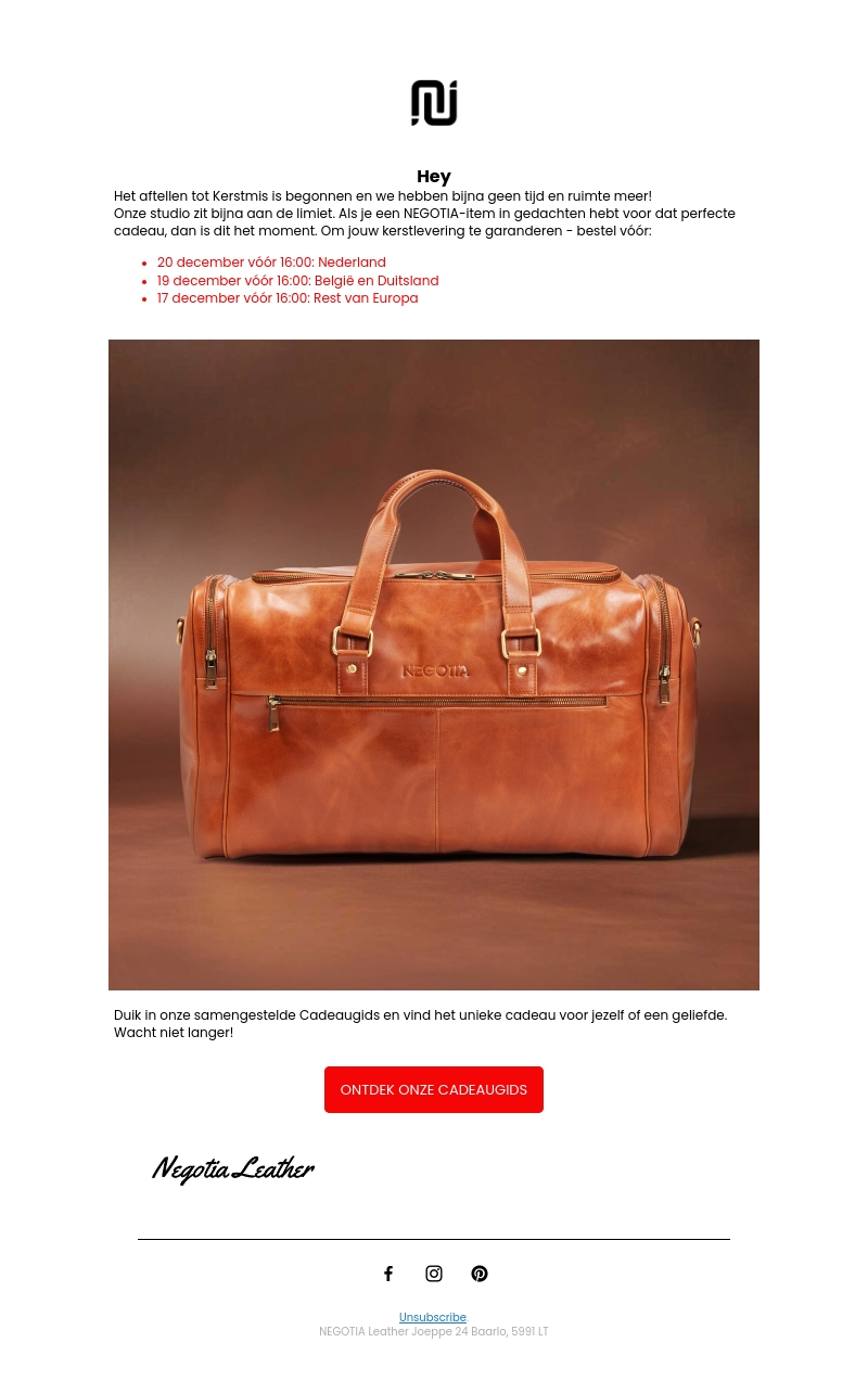 Het aftellen naar Kerstmis is begonnen en de tijd om cadeaus te bestellen raakt op! Zorg ervoor dat je jouw Negotia-item op tijd ontvangt door voor de aangegeven datums te bestellen. Laat je inspireren door onze cadeaugids en vind het perfecte cadeau voor jezelf of een geliefde.
