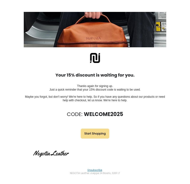 Dankzij je aanmelding ontvang je een exclusieve korting van 15% op je volgende aankoop bij Negotia Leather. Gebruik de kortingscode WELCOME2025 om te profiteren van deze aanbieding. Vergeet niet onze hoogwaardige producten te bekijken en contact op te nemen bij vragen.