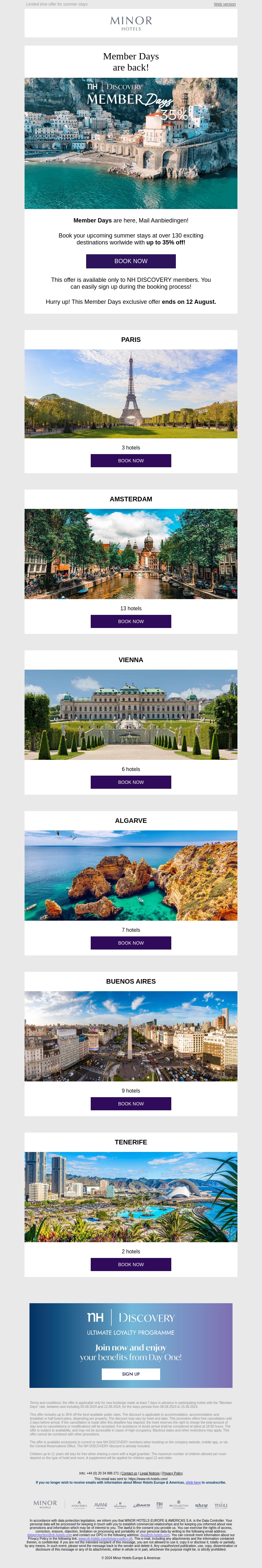 Member Days zijn terug bij Minor Hotels! Boek uw zomerverblijven met kortingen tot 35% in meer dan 130 bestemmingen wereldwijd. Speciale aanbieding voor NH DISCOVERY-leden, geldig tot 12 augustus.
