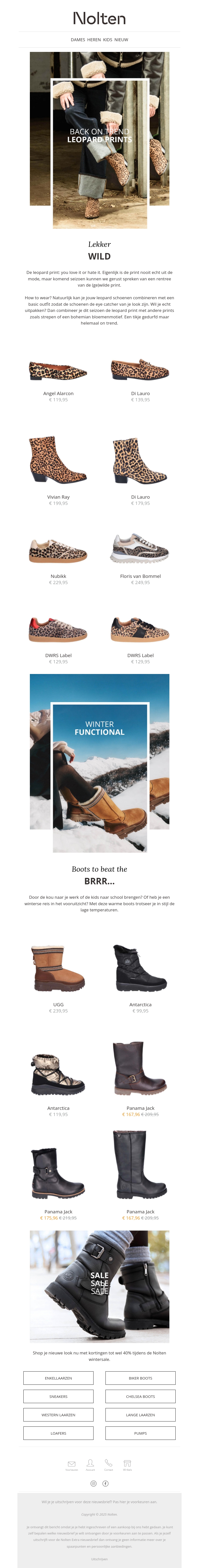 De luipaardprint is terug van weggeweest en helemaal klaar om jouw kledingkast te veroveren. Bij Nolten vind je een breed scala aan schoenen in deze trendy print, van laarzen tot sneakers. Of je nu op zoek bent naar iets uitdagends of iets gezelligs, er is voor elk wat wils. Mis de kans niet om te schitteren in deze wilde styles. Bekijk nu onze collectie en pas bij elke outfit een prachtig paar schoenen.
