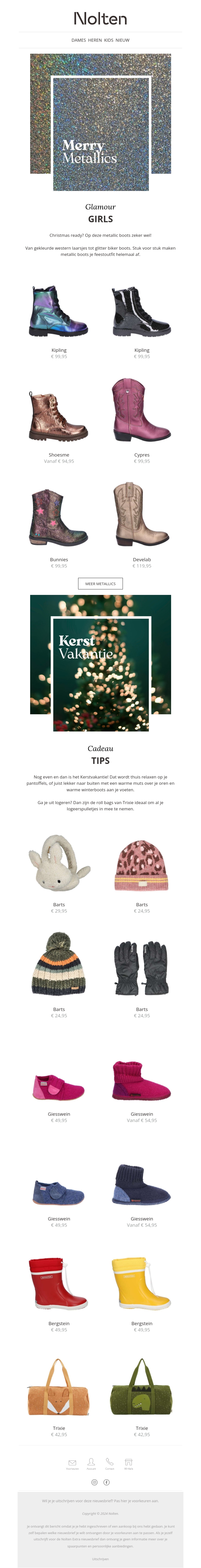 Deze nieuwsbrief van Nolten introduceert de sprankelende kerstcollectie voor meisjes. Ontdek diverse modieuze schoenen en accessoires, perfect voor de feestdagen. Duik in de wereld van Merry Metallics en laat elk klein modemeisje stralen. Inclusief cadeau-inspiratie voor een onvergetelijke kerst.