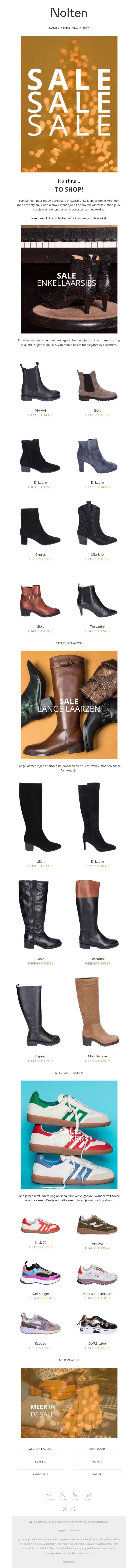 Ervaar geweldige kortingen op een breed scala aan schoenen, van stijlvolle enkellaarsjes tot comfortabele sneakers. Perfect voor de herfst, deze sale biedt iets voor iedereen. Mis de kans niet om je schoenenverzameling uit te breiden met luxe merken aan gereduceerde prijzen. Ook voor andere soorten schoenen kun je profiteren van fantastische aanbiedingen. Zelfs de nieuwste modellen zijn nu verkrijgbaar tegen scherpe tarieven. Winkel nu en geniet van de beste deals bij Nolten.