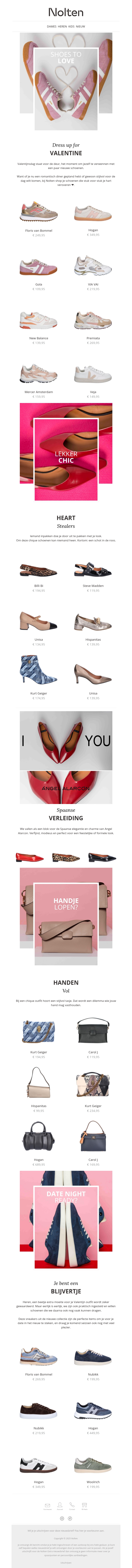 Deze nieuwsbrief van Nolten presenteert een selectie schoenen speciaal voor Valentijnsdag. Van sportieve sneakers tot elegante hakken, er is voor ieder wat wils. Ontdek de nieuwste collecties voor een perfecte date night look. Of je nu casual of chic wilt zijn, deze schoenen zijn een must-have. Ontvang exclusieve kortingscodes en shop jouw favorieten. Wees voorbereid op de meest romantische dag van het jaar!