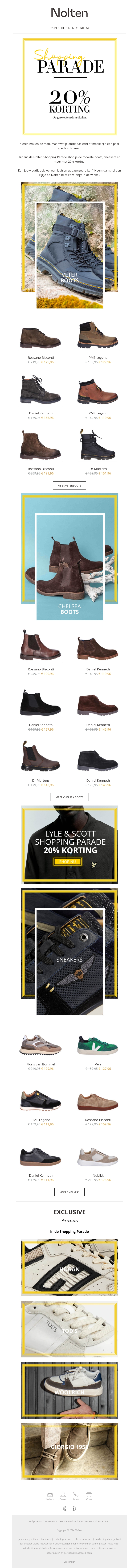 Beleef de Shopping Parade voor heren met een aantrekkelijke korting van 20%. Van stoere boots tot elegante schoenen, er is voor ieder wat wils. Daarnaast vind je ook Lyle & Scott mode-items om je look compleet te maken. Mis deze kans niet om je garderobe aan te vullen met kwaliteitskleding en accessoires. Profiteer nu van deze aanbieding en vernieuw je stijl.