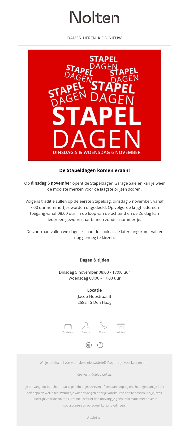 Bezoek de Stapeldagen Garage Sale op 5 november in Den Haag, waar je geweldige merken vindt voor de laagste prijzen. De sale opent om 08:00 uur met toegang volgens volgorde van nummering. Voor de vroege vogels worden vanaf 07:00 uur nummertjes uitgedeeld. De voorraad wordt dagelijks aangevuld, dus kom later gerust nog langs!