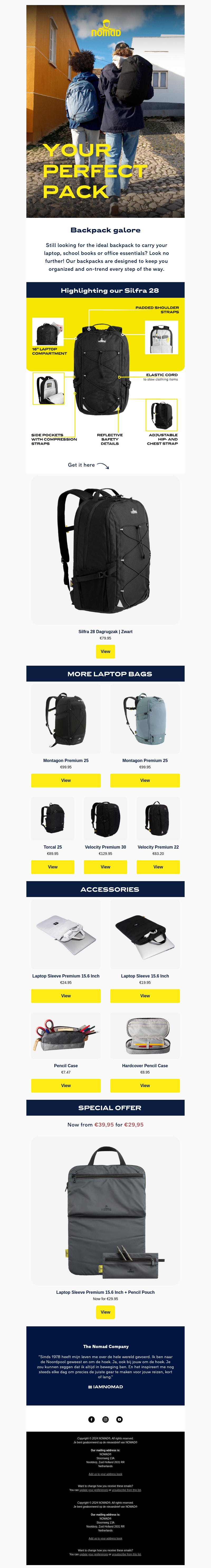 Op zoek naar de ideale rugzak om je laptop, schoolboeken of kantoorbenodigdheden in te vervoeren? Zoek niet verder! Onze rugzakken zijn ontworpen om jouw dagelijkse leven gemakkelijker en georganiseerder te maken. Ontdek nu ons uitgebreide assortiment van NOMAD rugzakken en accessoires.