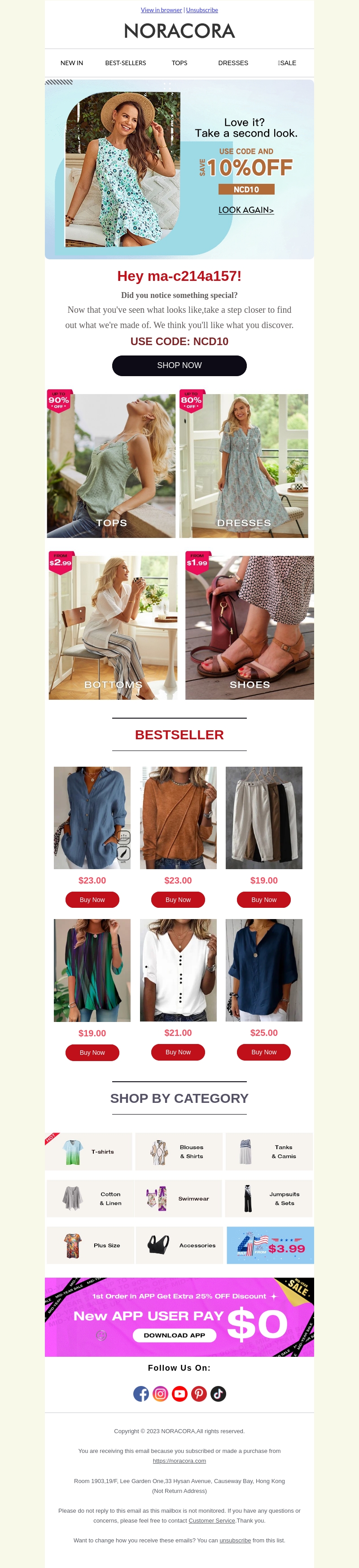 Mis het niet! Neem nog eens een kijkje en krijg 10% korting op je volgende aankoop bij NoraCora met de code NCD10. Bekijk onze nieuwste collectie van jurken, tops, broeken en schoenen. Profiteer van de beste aanbiedingen en vul je garderobe aan met de nieuwste mode tegen geweldige prijzen.