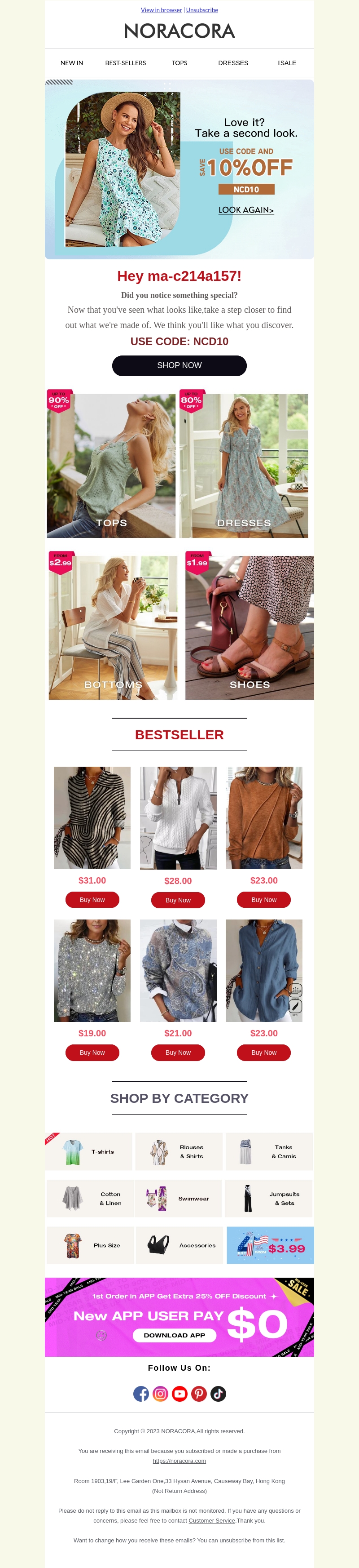 Mis de kans niet om je garderobe te vernieuwen met Noracora. Met 10% korting op de nieuwste collecties, is dit het perfecte moment om te shoppen. Verken de diverse categorieën van tops tot jurken en ontdek je nieuwe favoriete looks. Vergeet niet de kortingscode NCD10 te gebruiken.