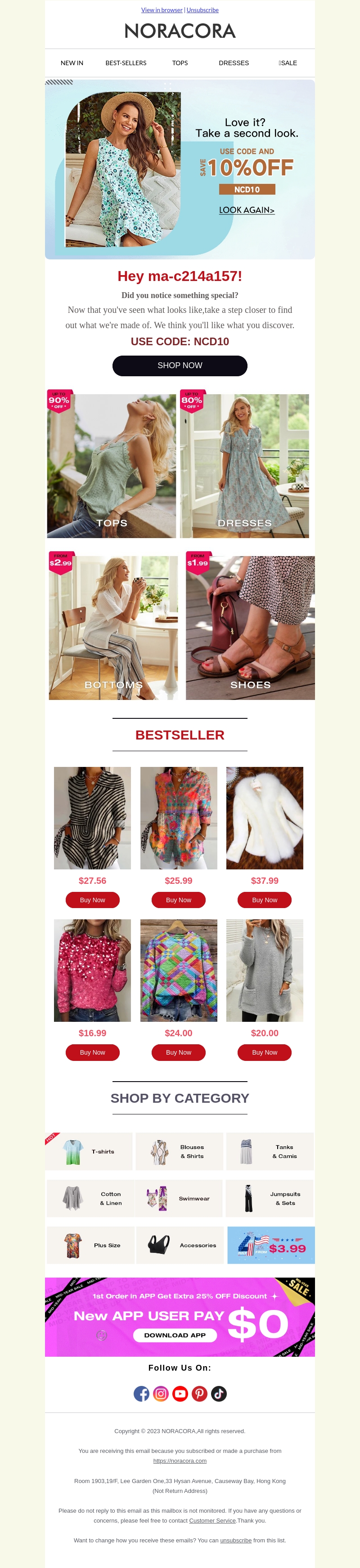 Verlies jezelf in de nieuwste collecties van NORACORA en ontvang een exclusieve korting van 10% op je volgende aankoop. Ontdek onze bestsellers en vernieuw je garderobe met de mooiste tops, jurken en meer. Maak gebruik van de kortingscode NCD10 bij het afrekenen en shop vandaag nog je favoriete items. Mis deze kans niet en kijk nu wat je allemaal kan ontdekken!