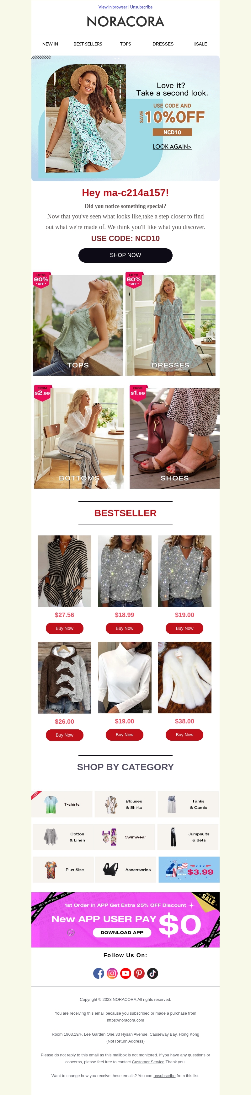 Grijp je kans bij Noracora met een exclusieve aanbieding van 10% korting. Mis de kans niet om trendy artikelen tegen geweldige prijzen te bemachtigen, inclusief topjes, jurken, en meer. Bezoek de bestsellers en ontdek nieuwe stijlen die je zeker zullen bevallen. Gebruik de code 'NCD10' en start je shopping spree vandaag nog!