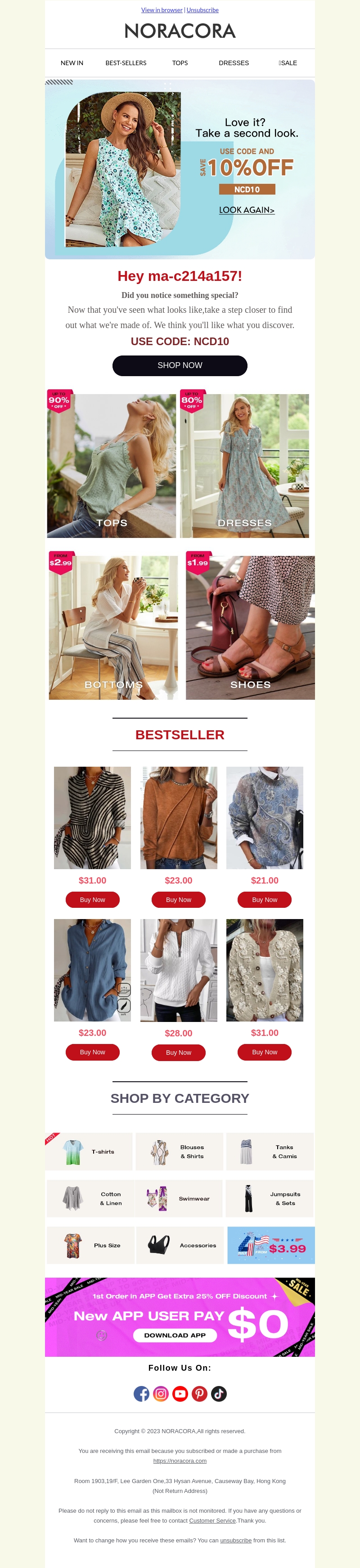 Mis deze kans niet om je garderobe bij te werken met kleding van NoraCora. Ontvang nu een extra 10% korting op alles met de code NCD10. Ontdek scherpe kortingsprijzen op tops, jurken, en meer. Beperkte tijd beschikbaar! Shop nu om de beste deals te pakken.