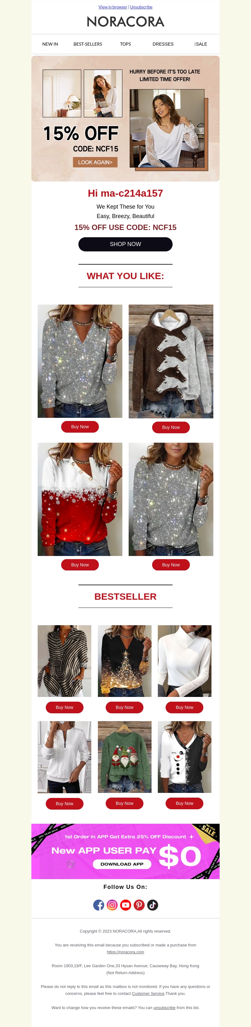 Haal het beste uit uw winkelervaring bij Noracora met een 15% korting op uw bestelling. Ontdek een selectie van trendy tops en jurken, speciaal voor u samengesteld. Wees er snel bij, want de aanbieding is beperkt. Shop nu en vang de beste deals voordat ze weg zijn.