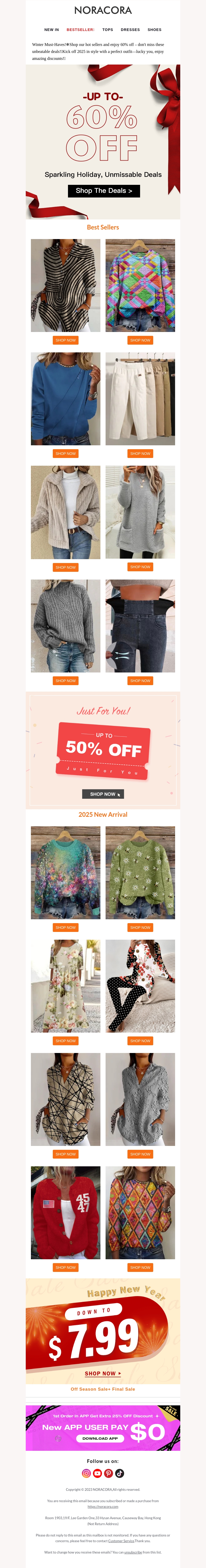 Ontdek de nieuwste aanbiedingen bij Noracora en shop je favoriete winteroutfits met tot wel 60% korting. Of je nu op zoek bent naar truien, jassen of accessoires, onze selectie zorgt ervoor dat je deze winter stijlvol blijft. Vergeet niet om gebruik te maken van onze speciale kortingsactie. Sla nu je slag en bespaar flink op je aankopen!