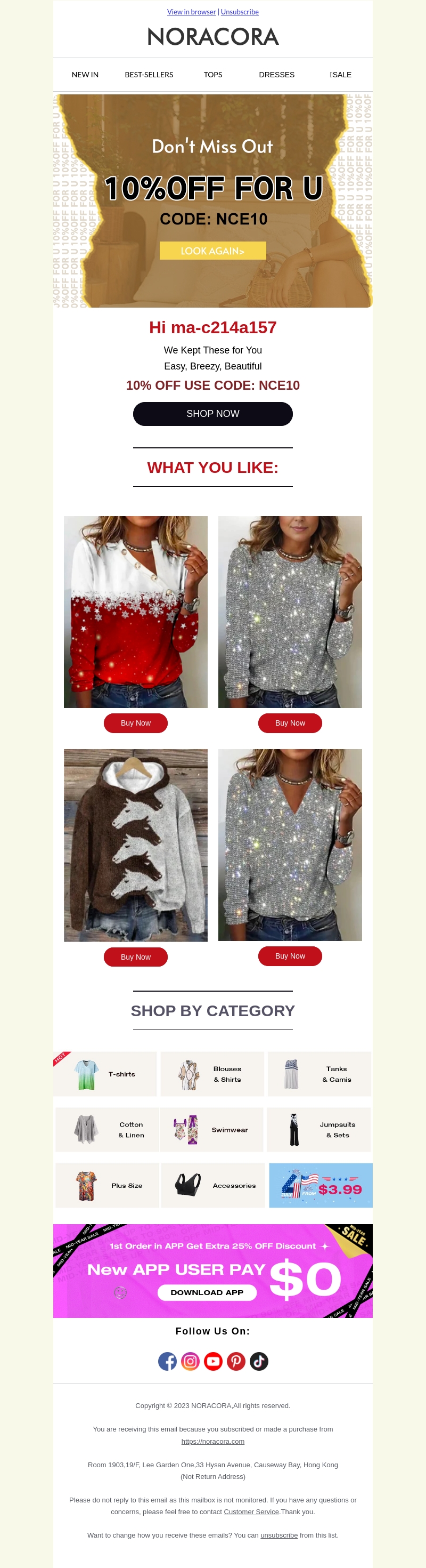 Ontvang nu 10% korting op uw aankoop bij Noracora met de code 'NCE10'. Verken een breed assortiment mode, inclusief tops, jurken en accessoires. Bestel direct om van deze tijdelijke aanbieding te profiteren. Met korting op een reeks stijlen, vind je zeker wat je zoekt. Bezoek nu de Noracora website voor meer informatie.