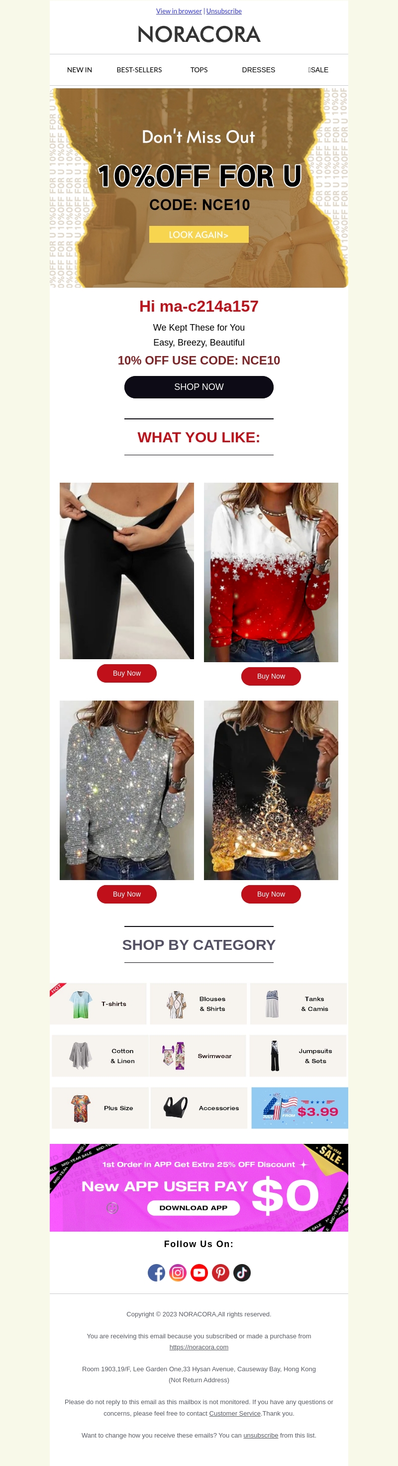 Verken de nieuwste modeaanbiedingen bij Noracora! Met de exclusieve kortingscode NCE10 geniet je van 10% korting op je favoriete items. Kies uit een breed assortiment kledingstukken, van trendy tops tot stijlvolle jurken. Profiteer nu en upgrade je garderobe voordelig. Deze aanbieding is te mooi om te laten liggen!