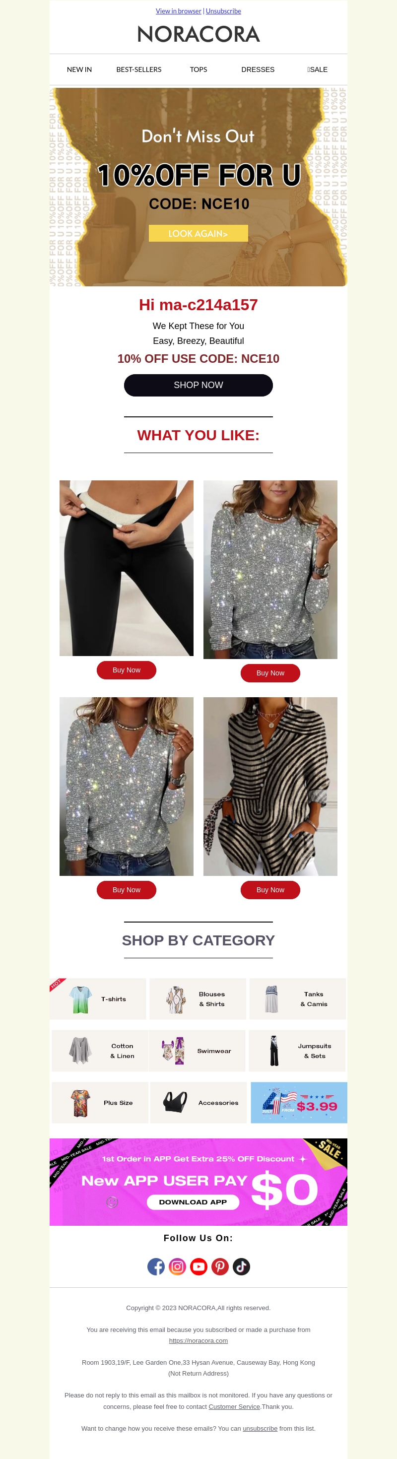 Ontvang 10% korting met de code NCE10 op prachtige mode-items van Noracora. Duik in onze collectie van bestsellers en blijf trendy met onze nieuwste stijlselecties. Mis deze kans niet en shop nu jouw favoriete items.