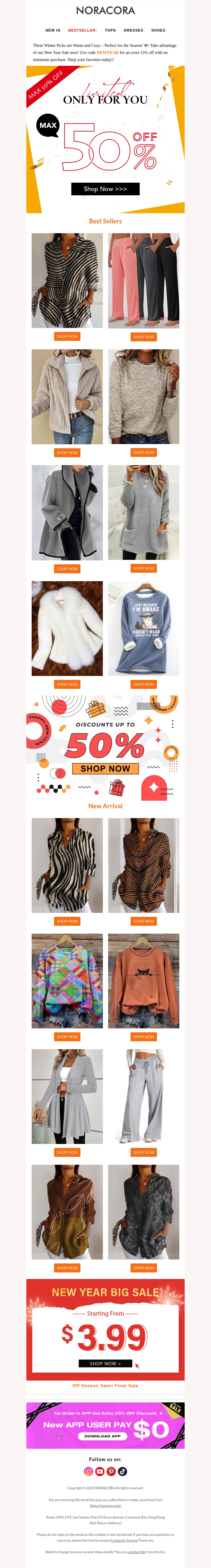 Duik in het nieuwe winterseizoen met Noracora's exclusieve aanbiedingen! Profiteer van kortingen tot 50% op onze bestsellers en nieuwe collecties. Ontdek de laatste trends en vind jouw perfecte winteroutfit. Met artikelen beginnend bij slechts $3.99, is er voor ieder wat wils. Bezoek nu de website en vul je winkelmandje.