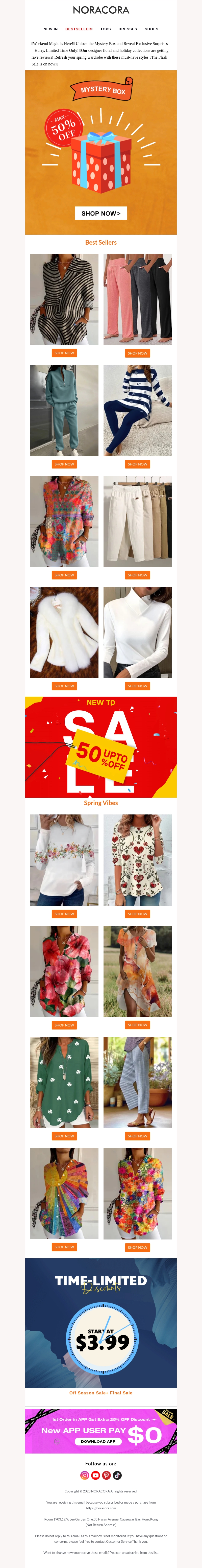Deze nieuwsbrief van Noracora nodigt je uit om de verrassingen van het weekend te ontdekken. Met een Mystery Box aanbieding kun je nu tot 50% besparen op diverse modetrends. Van bestsellers tot nieuwe seizoenscollecties, er is voor ieder wat wils. Mis de kans niet om tijdloze kledingstukken te bemachtigen tegen gereduceerde prijzen. Download de app voor extra kortingen en shop je favoriete looks. Tijdelijke aanbiedingen, zolang de voorraad strekt!
