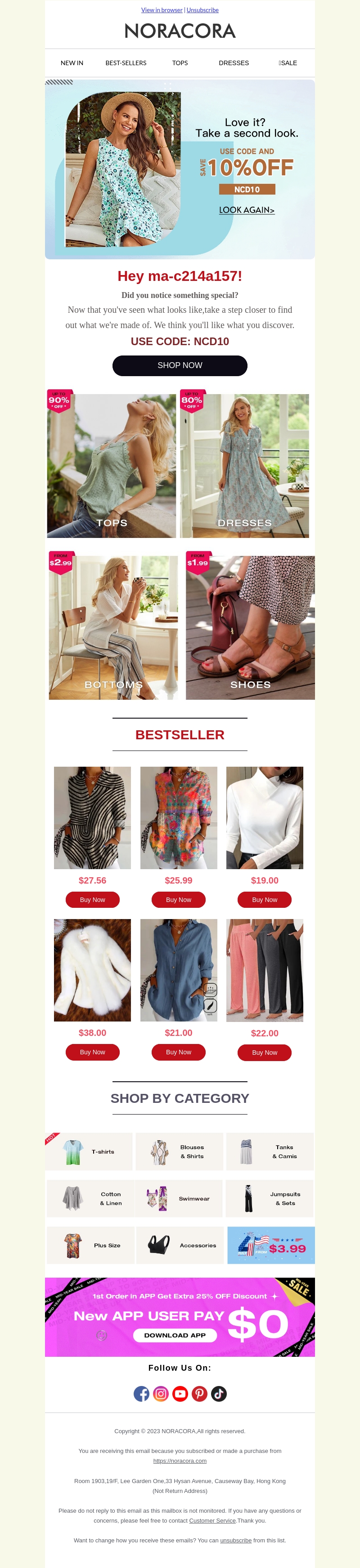 Welkomstkorting bij Noracora! Geniet van 10% korting met de code NCD10. Verken onze nieuwste collectie, waaronder bestsellers en categorieΓ«n zoals tops, jurken en schoenen. Mis deze geweldige aanbiedingen niet en winkel vandaag nog.