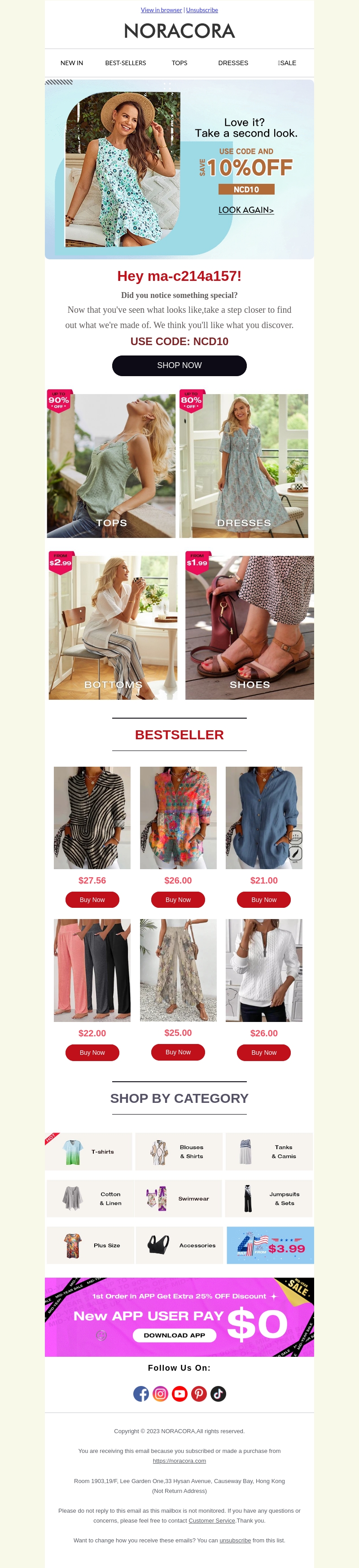 Noracora verrast je met een exclusieve 10% korting op je volgende aankoop. Verken een breed aanbod aan stijlvolle tops, jurken, bottoms, en schoenen. Profiteer van geweldige aanbiedingen zoals producten vanaf slechts $2.99. Gebruik de code NCD10 en koop nu voordelig. Mis deze kans niet om je garderobe aan te vullen met de nieuwste trends!