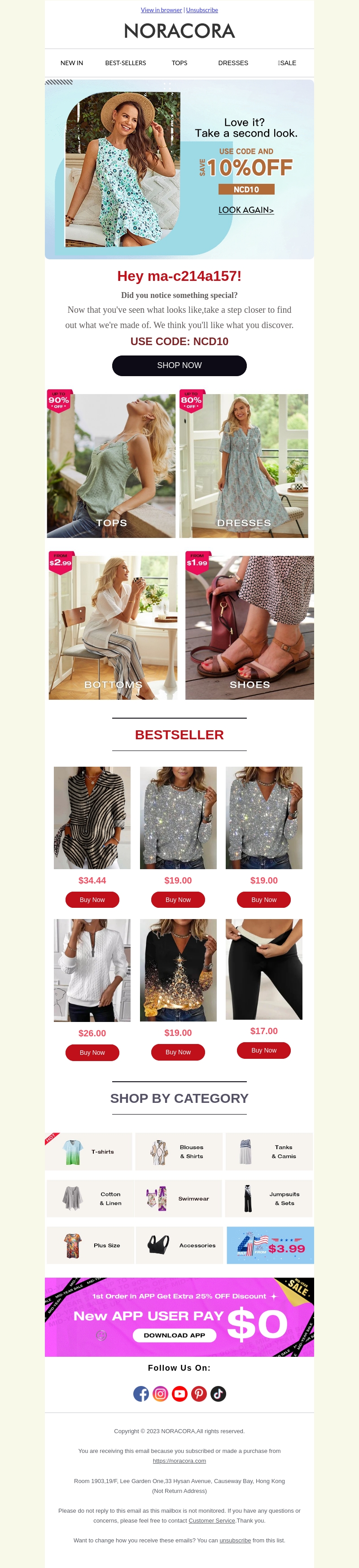 Mis de kans niet om met 10% korting te shoppen bij Noracora! Ontdek onze nieuwste tops, jurken en meer. Gebruik code NCD10 voor geweldige besparingen en maak je garderobe compleet met onze bestseller items. Verras jezelf met deze unieke stijlen!