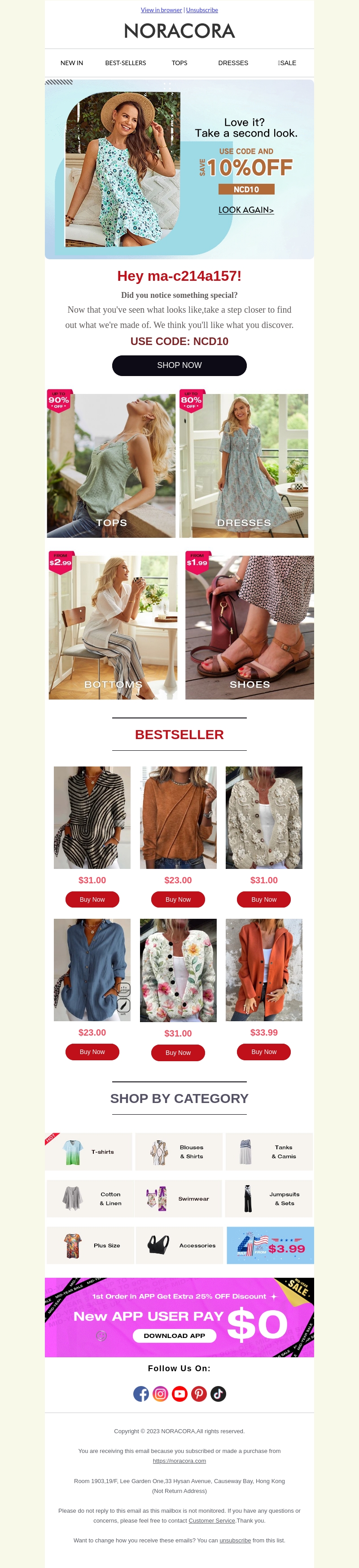 Bekijk de nieuwste modeaanbiedingen bij Noracora met kortingen tot 90%! Gebruik de code NCD10 voor een extra 10% korting op je aankoop. Mis deze kans niet om je garderobe te vernieuwen met onze bestsellers in tops, jurken, en meer. Shop vandaag nog en geniet van geweldige deals. Vergeet niet onze exclusieve app-korting voor nieuwe gebruikers te bekijken.
