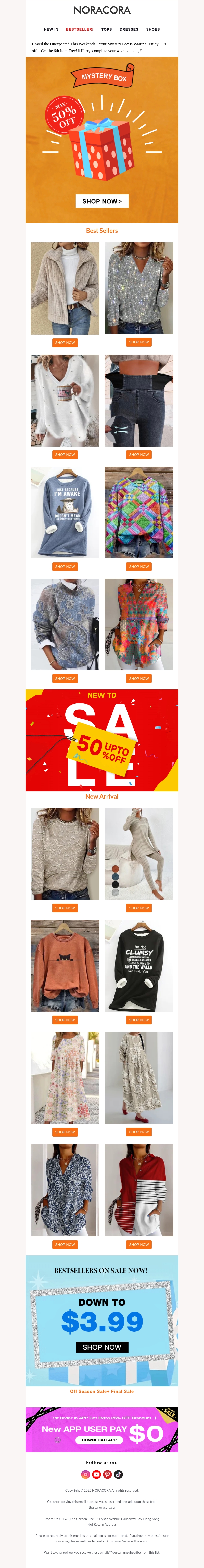 Deze nieuwsbrief van Noracora introduceert de spannende Mystery Box aanbieding voor het weekend. Ontvang tot 50% korting op geselecteerde items en ontdek verrassingen bij elke aankoop. Bekijk nu de bestsellers en nieuwe aankomsten met geweldige aanbiedingen. Shop trendy kleding en accessoires voor ongeëvenaarde prijzen. Mis de exclusieve app-aanbiedingen niet voor nog meer besparingen.