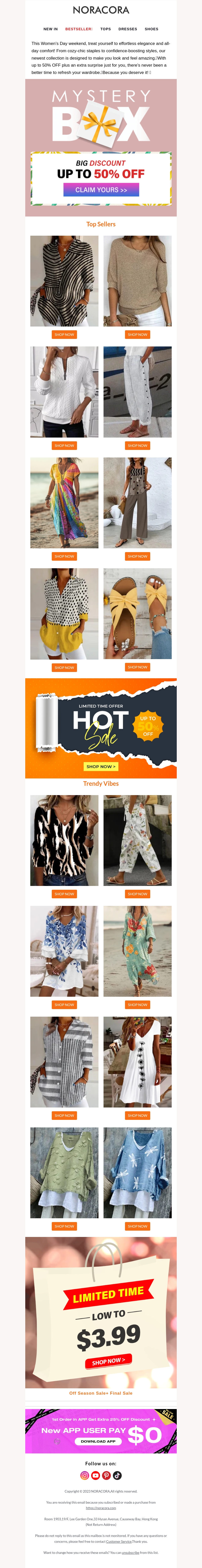 Vier Vrouwendag in stijl met speciale weekendkortingen tot 50% op Noracora's nieuwste collectie. Ontdek topverkopers en trendy items, speciaal voor deze gelegenheid. Mis deze kans niet om jezelf te verwennen met betaalbare mode. Bekijk onze mysterieuze box-aanbiedingen voor extra verrassing en plezier. Vergroot je winkelervaring met extra korting via onze app. Snel winkelen terwijl de voorraad strekt!