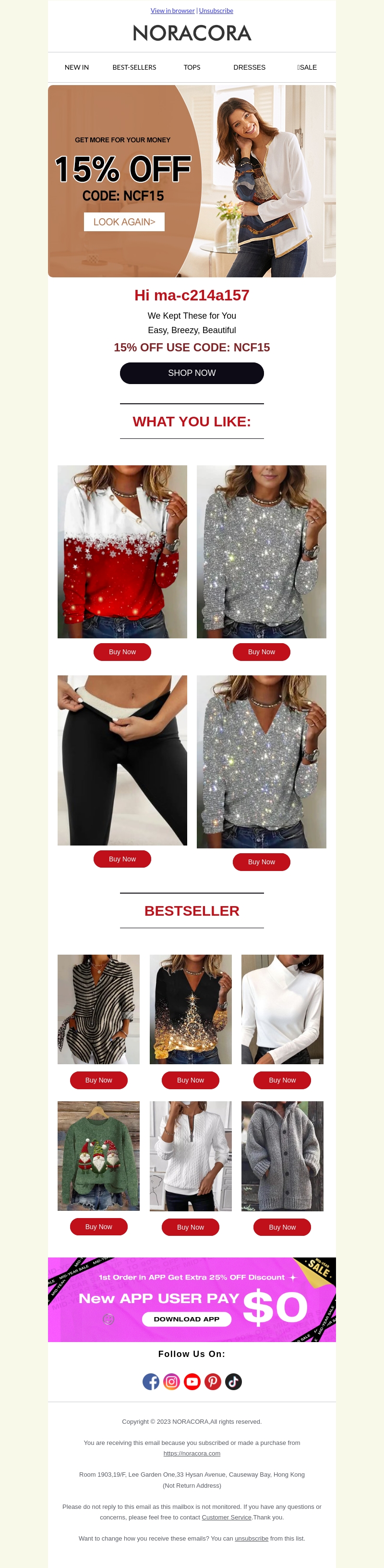 Mis deze geweldige aanbiedingen niet bij Noracora! Geniet van 15% korting op geselecteerde items met de code NCF15. Verken een verscheidenheid aan trendy tops, jurken en meer. Vind precies wat je zoekt en sla je slag voor de beste deals. Haal het meeste uit je winkelervaring met exclusieve kortingen. Schrijf je nu in en ontdek de must-have mode van het seizoen.