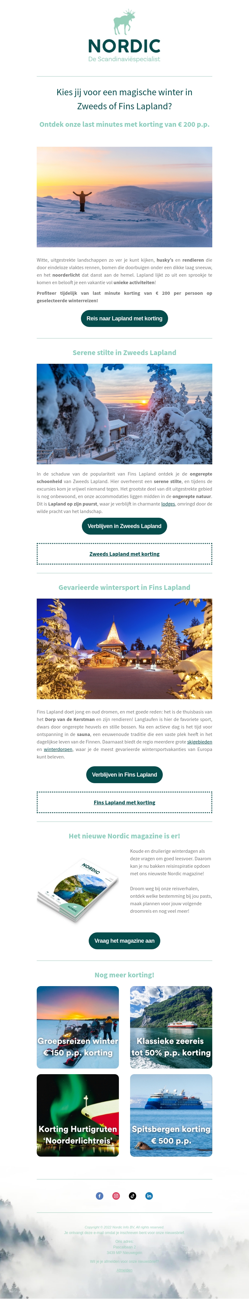 Ervaar de serene stilte van Zweeds Lapland en de veelzijdige wintersportmogelijkheden in Fins Lapland. Geniet van unieke accommodaties en ongerepte landschappen. Ontdek de charme van husky- en rendiertochten tijdens magische winterdagen. Profiteer nu van last-minute kortingen vanaf €200 per persoon op uw winterreis.