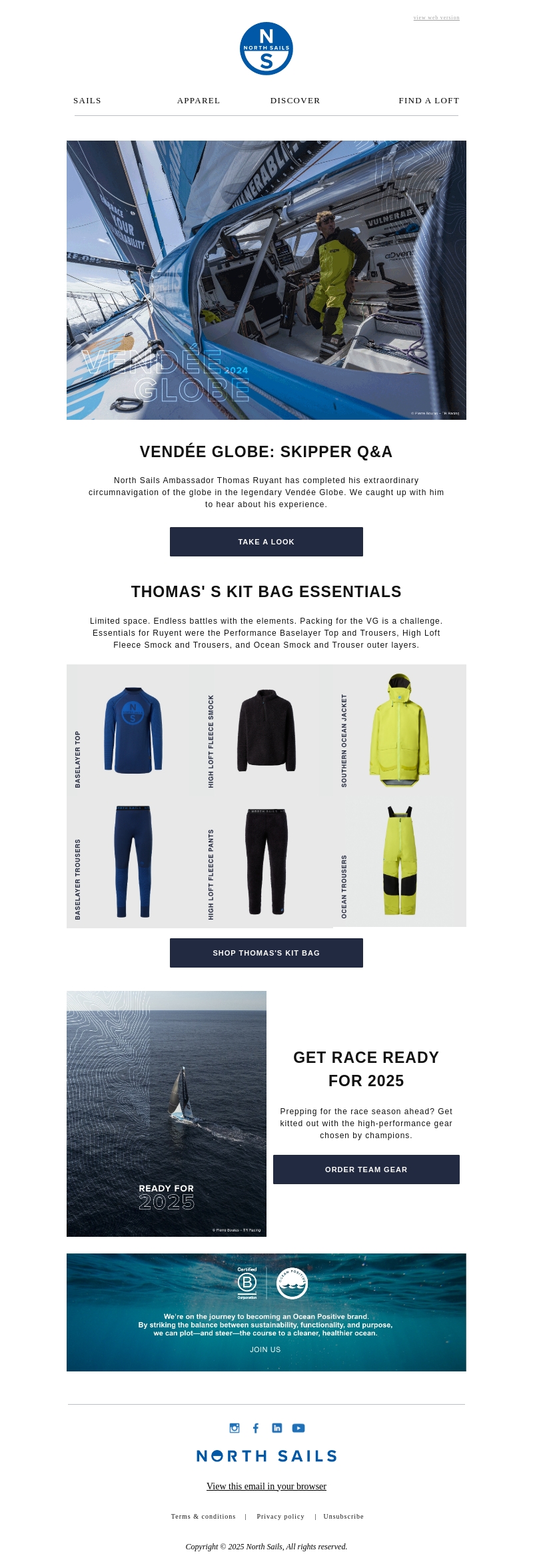 In deze nieuwsbrief lees je over de avonturen van Thomas Ruyant in de Vendée Globe. Ontdek welke uitrusting hij gebruikte voor zijn reis en bereid je voor op de volgende races. Lees ook over North Sails' inzet voor duurzaamheid.