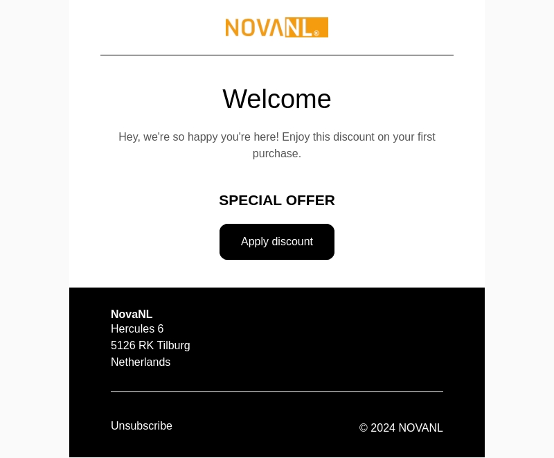 Hey, we zijn zo blij dat je hier bent! Als welkomstgeschenk bieden wij je een speciale korting op jouw eerste aankoop bij NovaNL. Aarzel niet en maak gebruik van deze kans om geweldige producten tegen een gereduceerde prijs te ontdekken.